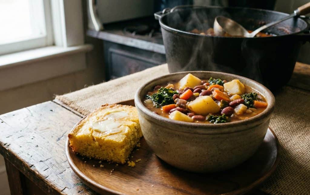 Potatoes, rice, cornmeal, and heavy soups were the staples.