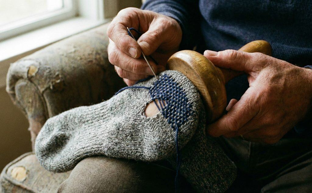 When a heel wore through, you used a “darning egg”—a wooden tool to hold the shape—and wove new threads across the hole.