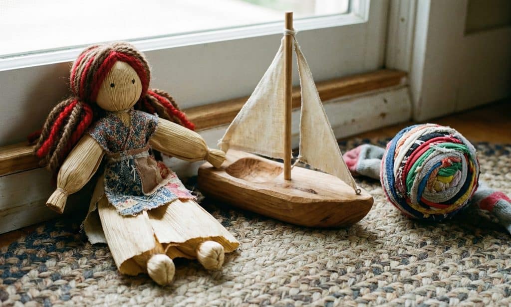 A doll made from corn husks, a fort made from a cardboard box, or a jump rope braided from scrap fabric.