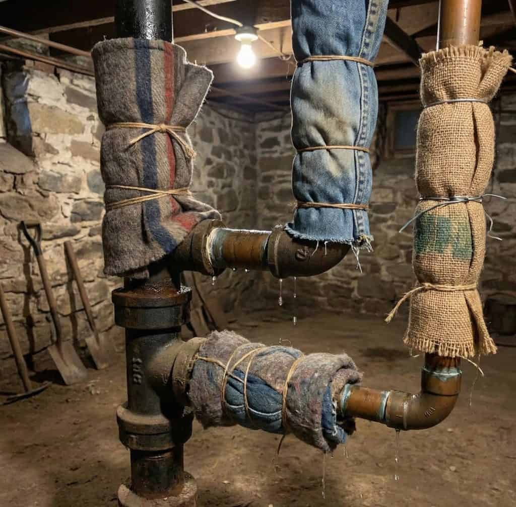 Old wool coats, worn-out denim, and burlap sacks were cut into strips and wrapped tightly around basement pipes like a bandage.