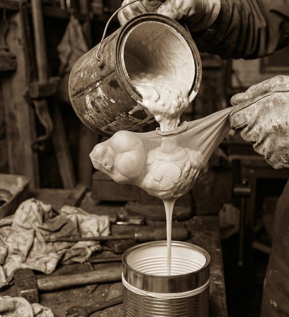 Paint was precious. But leave a can sitting for a year, and it develops a gross skin and lumps.
