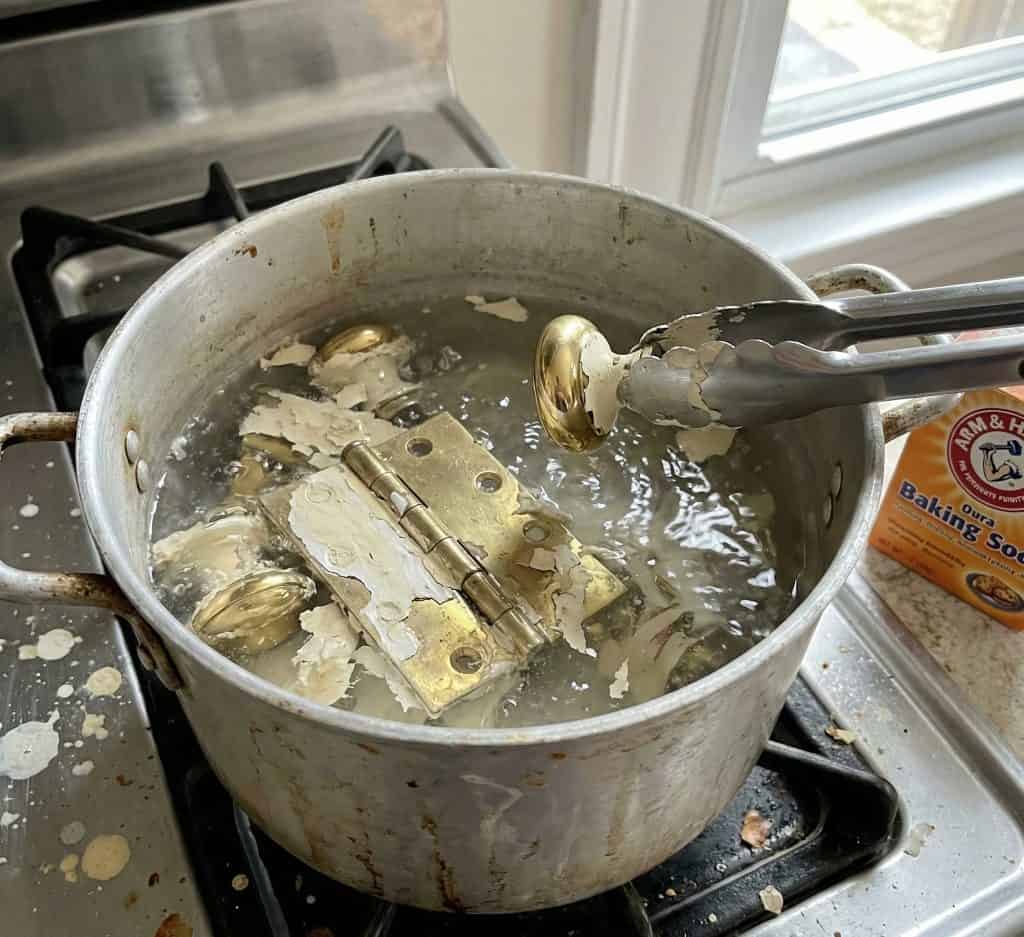 Drop the painted hinges and knobs into an old pot of boiling water with a scoop of baking soda. Let it simmer for 20 minutes.