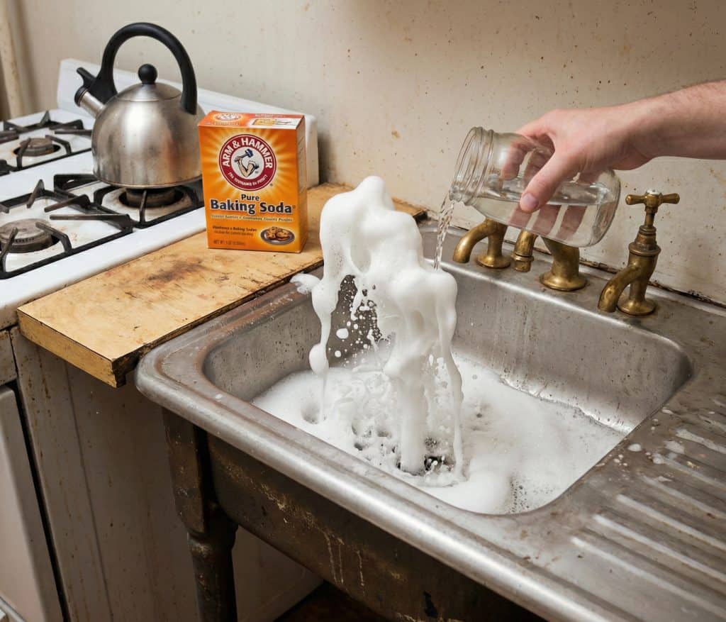 It fizzes violently—the same “volcano” experiment you did in school. That reaction breaks up grease and soap scum instantly. Flush it with boiling water. The pipes run clear.