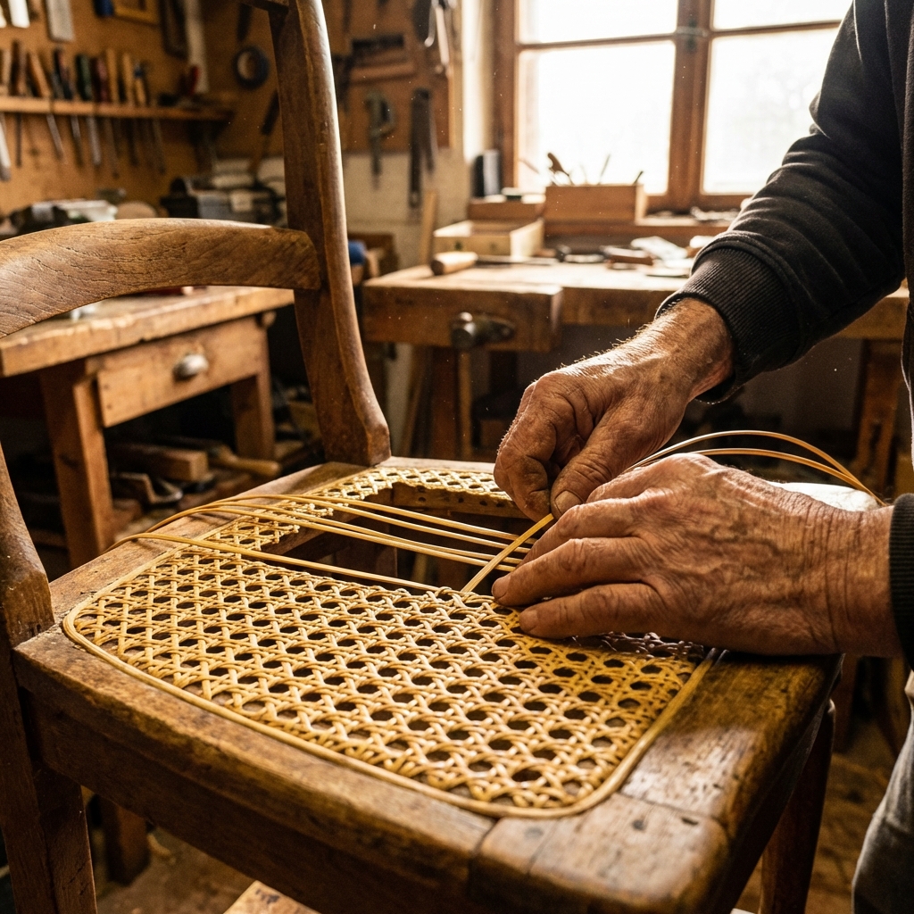 The number of people who can properly cane or rush a chair seat has been declining for decades. When a caned seat breaks today, most people throw the chair away rather than find someone to repair it — because finding someone is nearly impossible.