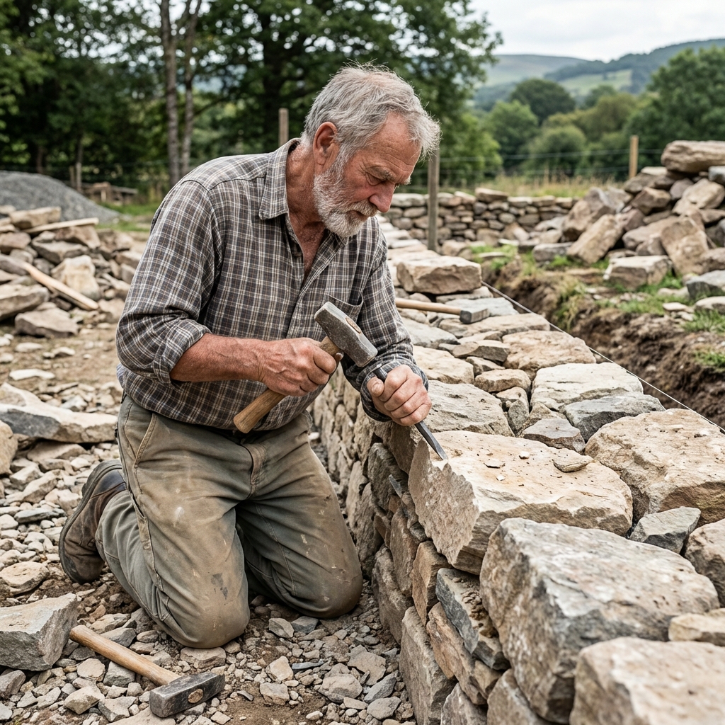 Not bricklaying — stone masonry. The art of selecting, shaping, and fitting natural stone into walls, fireplaces, arches, and foundations without relying on concrete or modern adhesives.
