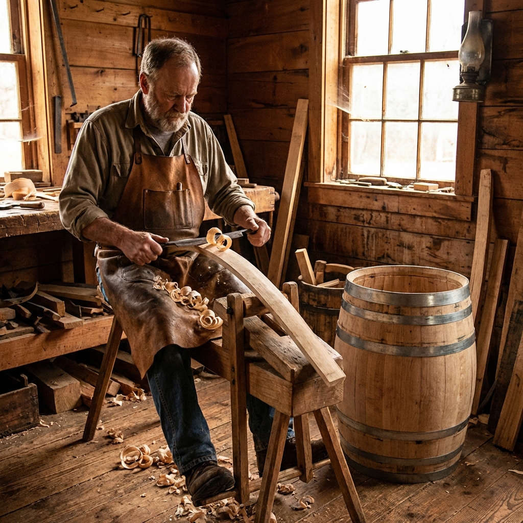 The staves had to be tapered, beveled, and curved so precisely that when assembled, the barrel was completely watertight without any adhesive or sealant. The cooper shaped each stave with a drawknife and set the hoops with a driver and hammer.