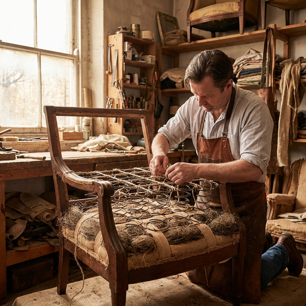 Traditional upholstery was an entirely different craft. The upholsterer built the seat from the frame up — installing webbing, tying coil springs by hand in an eight-way pattern, layering horsehair or cotton batting, and shaping everything before the fabric ever went on.