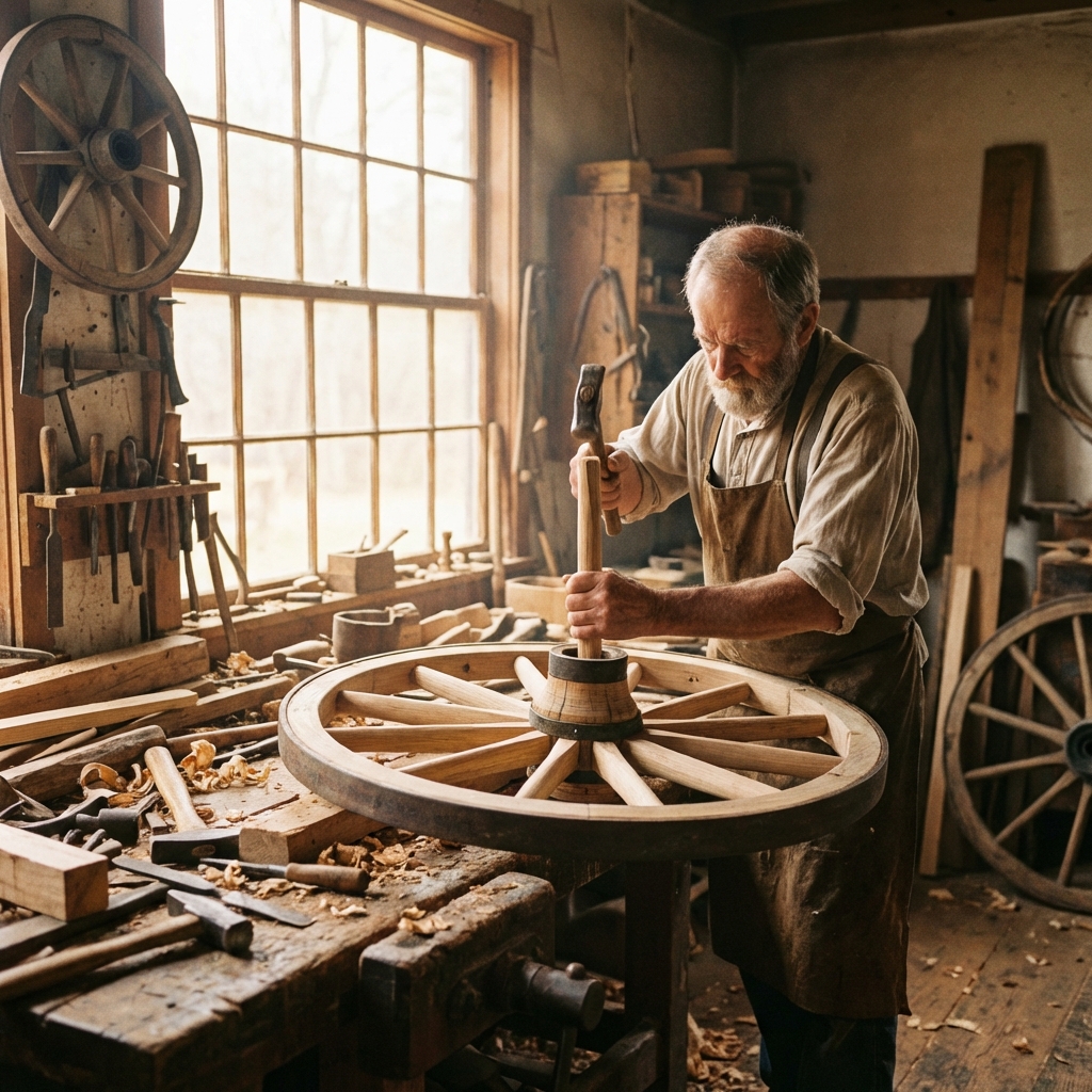 A wheelwright had to shape a hub from a single block of hardwood, cut and fit the spokes at precise angles, bend and fit the felloes (the rim sections), and then shrink-fit an iron tire around the whole thing.