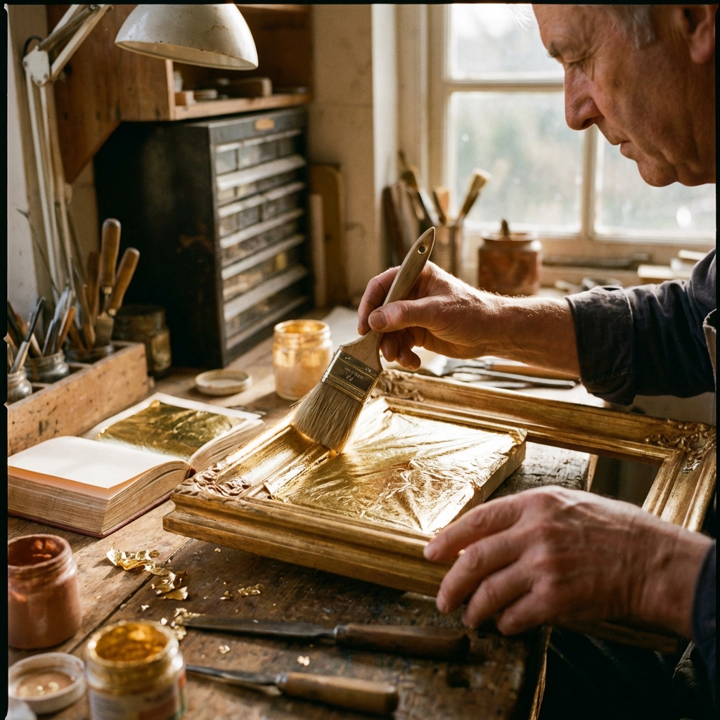 Applying gold leaf is painstaking work. The sheets are so delicate that a breath will blow them away. The gilder applies a tacky sizing to the surface, carefully lays the gold leaf with a soft brush, and burnishes it smooth.