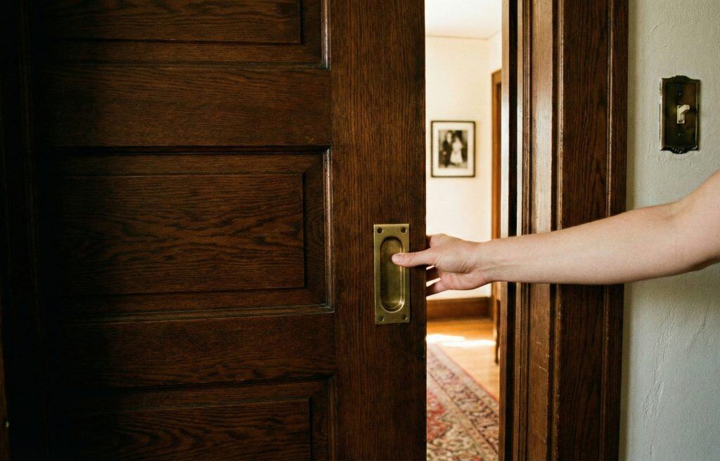 Old doors used “Mortise Locks”—heavy iron boxes set deep into the wood.