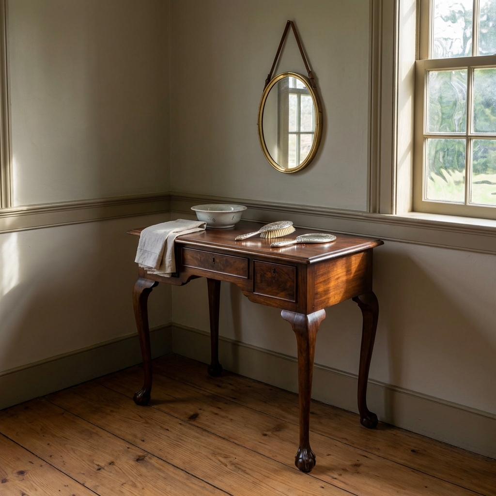 A mirror hung on the wall above it. A hairbrush, a comb, and a hand mirror sat on top. It was the personal grooming station of every well-appointed colonial bedroom.