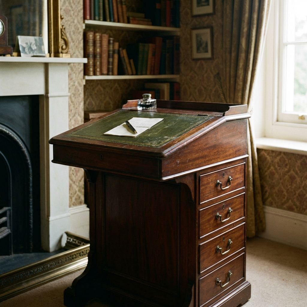 It was a small, compact writing desk with a slanted top that lifted on hinges, drawers running down one side (sometimes both), and a flat or slightly recessed top surface just large enough for a sheet of paper, a pen, and an inkwell.