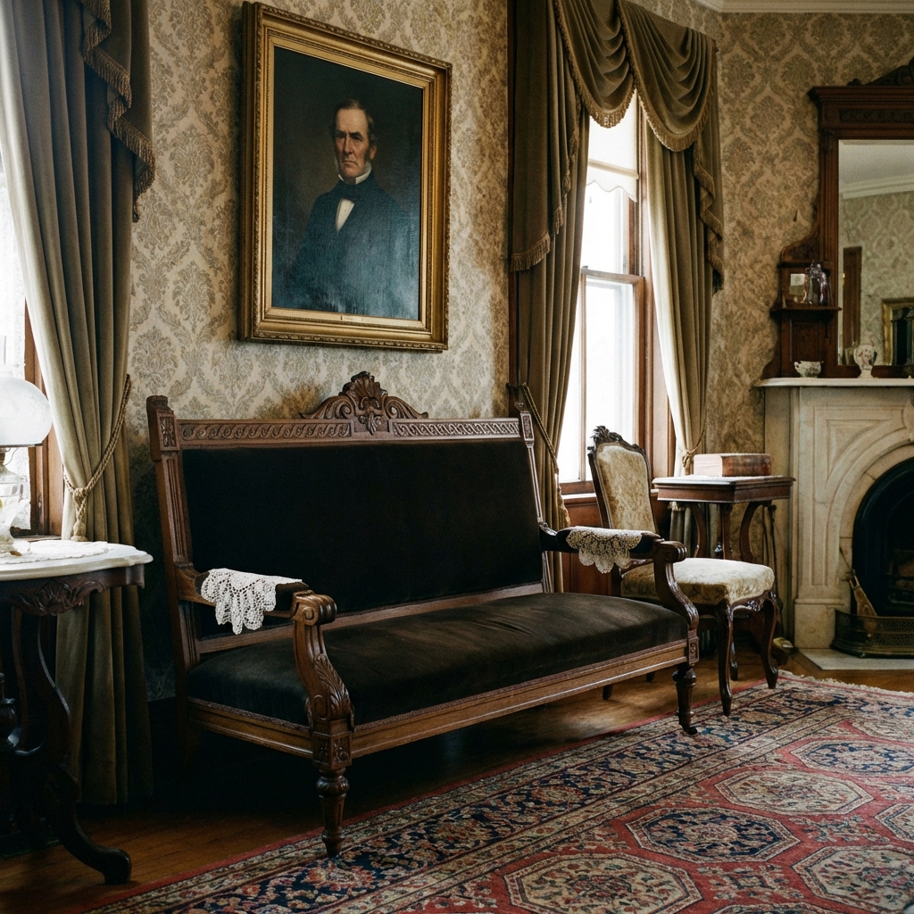 It was a small, stiff, two-person bench — usually with a carved wooden frame, a straight back, and thin upholstered cushions that offered approximately zero comfort. It lived in the front parlor, which was the room reserved for guests and formal occasions.