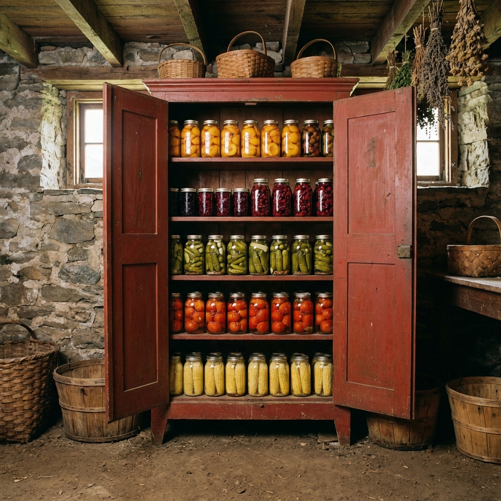 The jelly cupboard was a simple, tall, narrow cabinet — usually built from pine, poplar, or cherry — with one or two solid doors on the front and several deep shelves inside. It stood in the kitchen, the pantry, or the cellar, and it held jars of homemade jam, jelly, pickles, preserves, and canned vegetables.