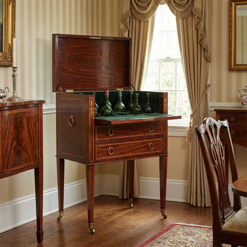 Cellarettes ranged from simple country pieces to elaborate Hepplewhite or Sheraton designs with inlaid wood, tapered legs, and brass fittings. Some were octagonal. Some were urn-shaped. All were locked with a key — because alcohol was expensive, and servants had access to the house.