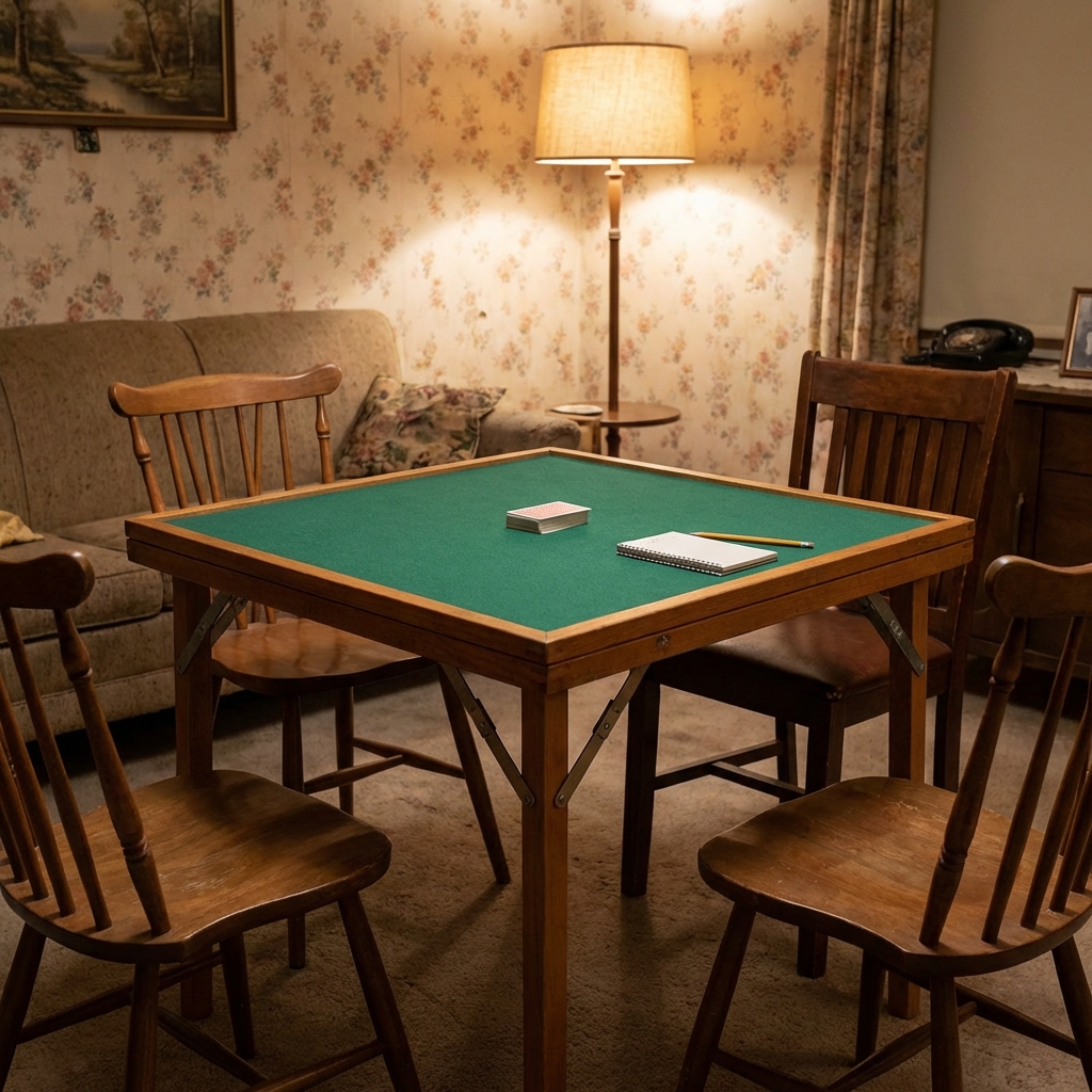 The card table was a folding or flip-top table — usually square — with a playing surface covered in green felt or baize. When folded, it stood as a narrow side table against the wall. When opened, four legs supported a full-size playing surface for bridge, poker, canasta, or whatever the game of the week was.