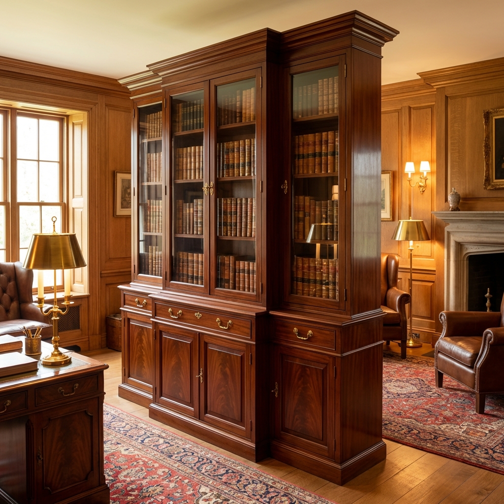 It was a massive piece of furniture — often seven or eight feet wide and just as tall — with glass-doored upper cabinets for displaying books, a flat writing surface or set of drawers in the middle, and solid-doored lower cabinets for storage.