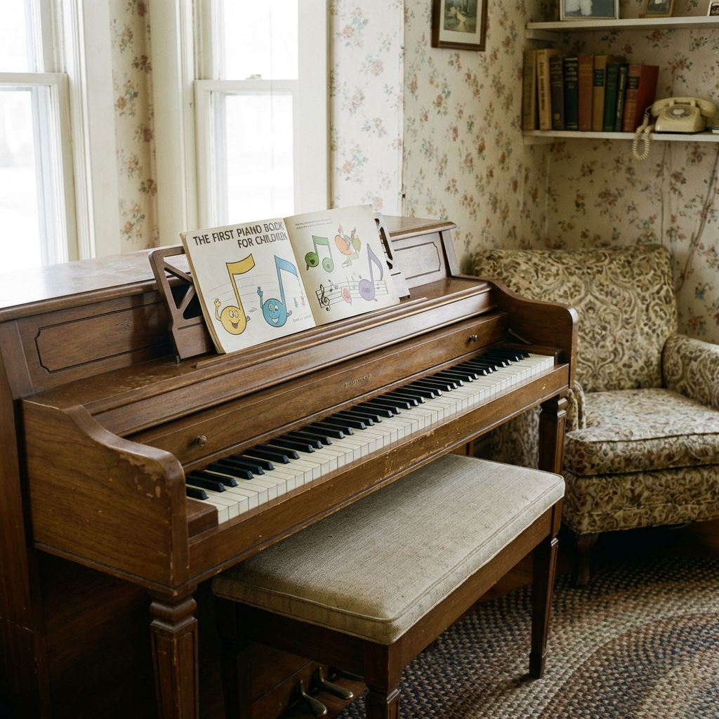 The spinet was the answer. It was a small, compact upright piano — usually about 36 to 40 inches tall — designed to fit against a wall in a modest-sized parlor or living room. The action was simplified and the strings were shorter, which made the tone thinner than a full upright, but it was affordable and it fit in the house.
