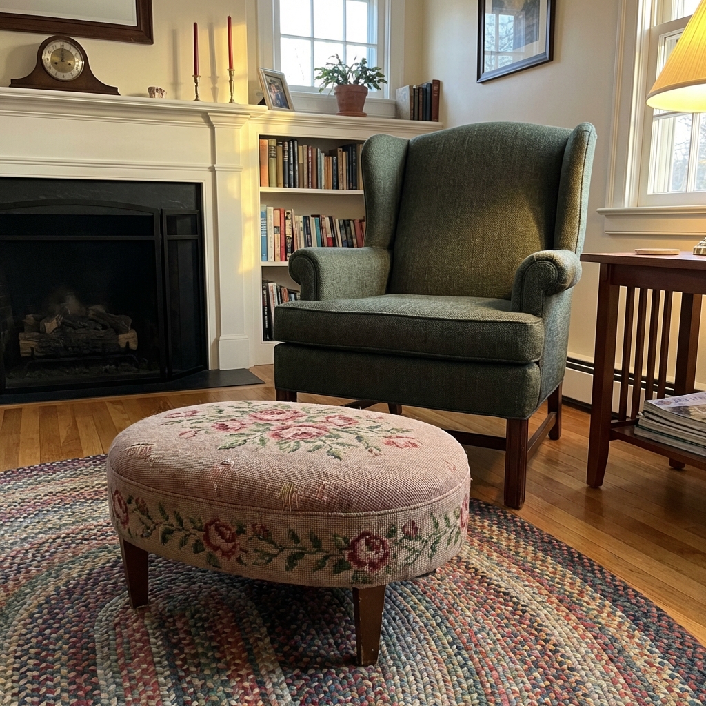 The needlepoint footstool was a low, padded ottoman — usually about 12 inches square — covered in a needlepoint or cross-stitch design that someone in the family stitched by hand over the course of weeks or months. Roses were the most popular design. Birds, houses, and geometric patterns were common too.