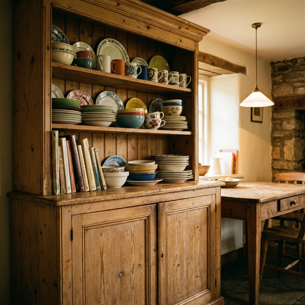 It was a two-piece cabinet, usually built from pine or oak. The bottom half had solid doors and drawers for storing tablecloths, napkins, serving utensils, and kitchen odds and ends. The top half had open shelves — sometimes with plate grooves cut into them — where the everyday dishes, cups, and bowls lived in plain sight.