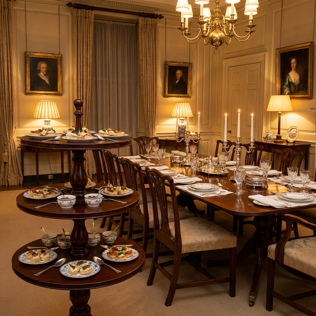 The dumbwaiter table was a small, three-tiered rotating stand — usually about three feet tall — with round or oval shelves stacked vertically on a central pedestal. Each tier held food, drinks, or condiments, and the whole thing could be placed next to the dining table so guests could help themselves without asking a servant to pass anything.