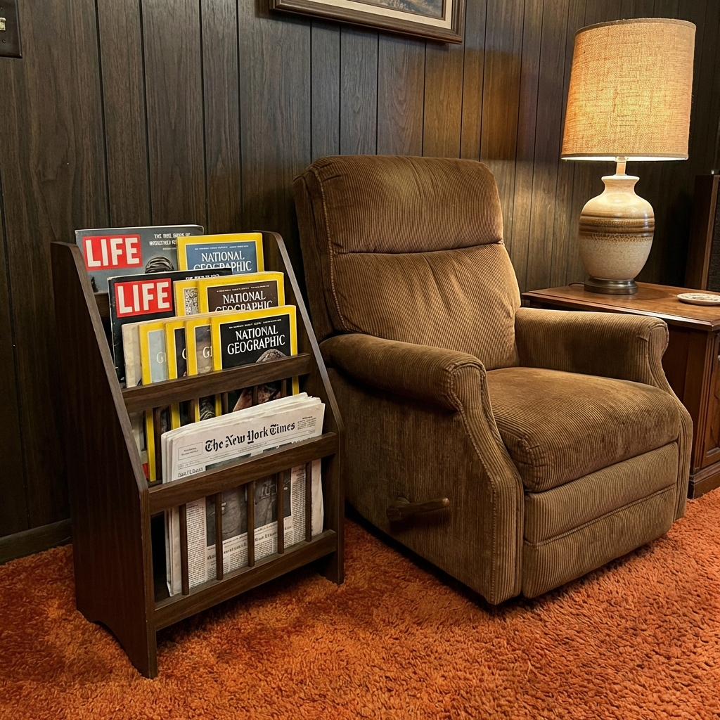 Reader’s Digest. National Geographic. TV Guide. The Sunday paper. The Sears catalog. Everything lived in the magazine rack, slightly crumpled and perpetually overstuffed.