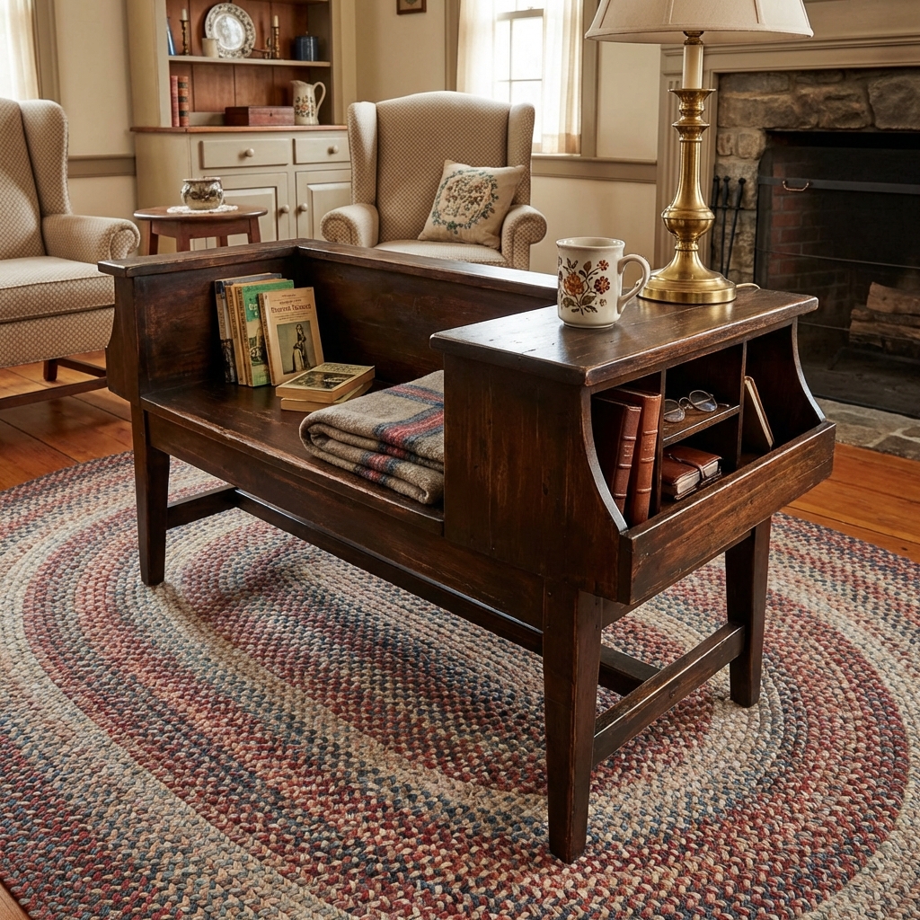 But the design was so simple, so sturdy, and so useful that it migrated into American homes. It sat in entryways, on porches, in mudrooms, and along hallway walls. You put your shoes on there. You waited for rides there. Groceries got set down there before being put away.
