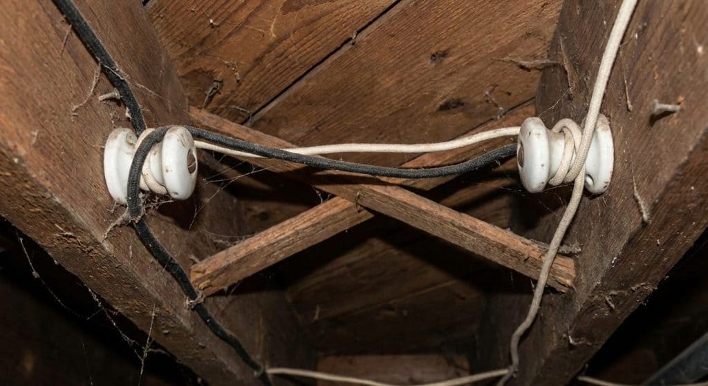 If you see white ceramic knobs with cloth-covered wires running through them, you have a problem.