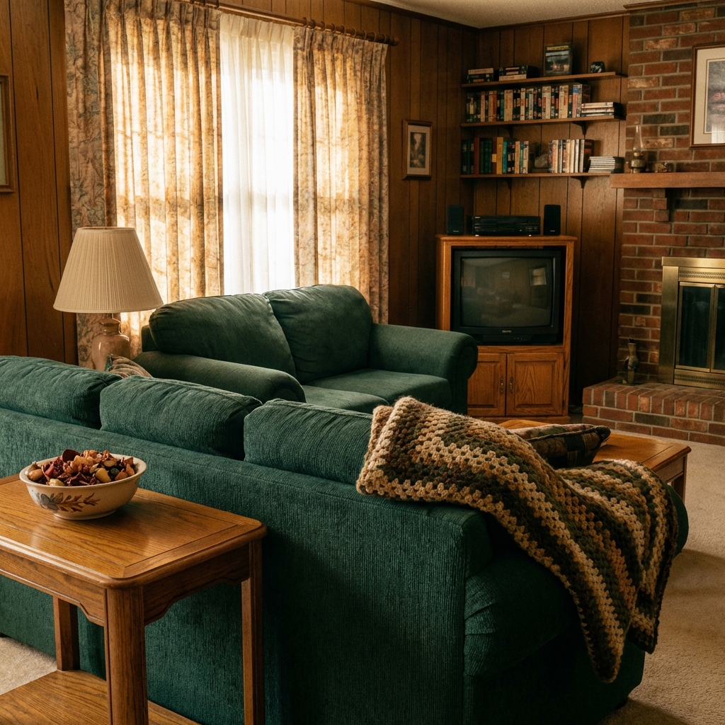 They came in hunter green, burgundy, or dark blue — always solid colors, never patterned. And they were everywhere. Every living room, every family room, every finished basement.