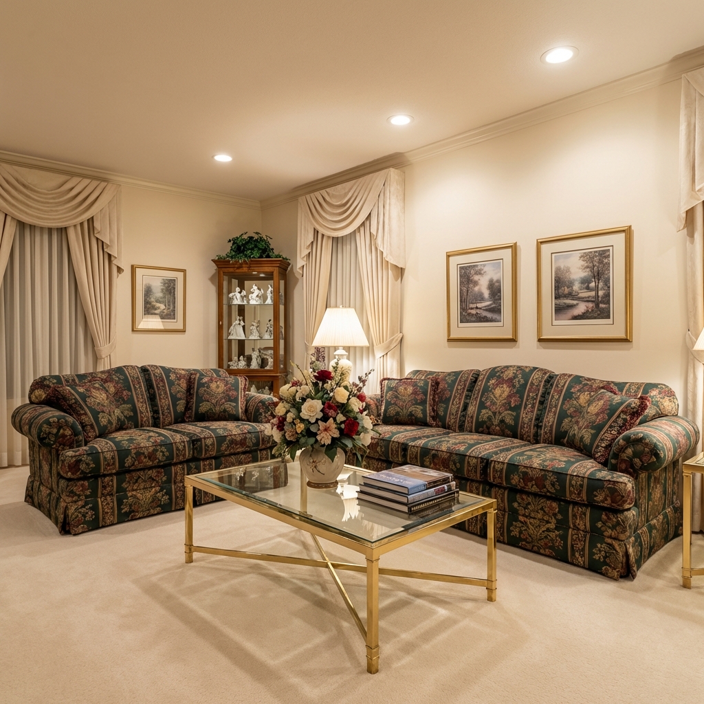 It was right off the front entryway. It had the nicest furniture in the house — usually a matching sofa and loveseat that still looked brand new because nobody was allowed to sit on them. A glass coffee table. Maybe a china cabinet. Definitely a silk flower arrangement.