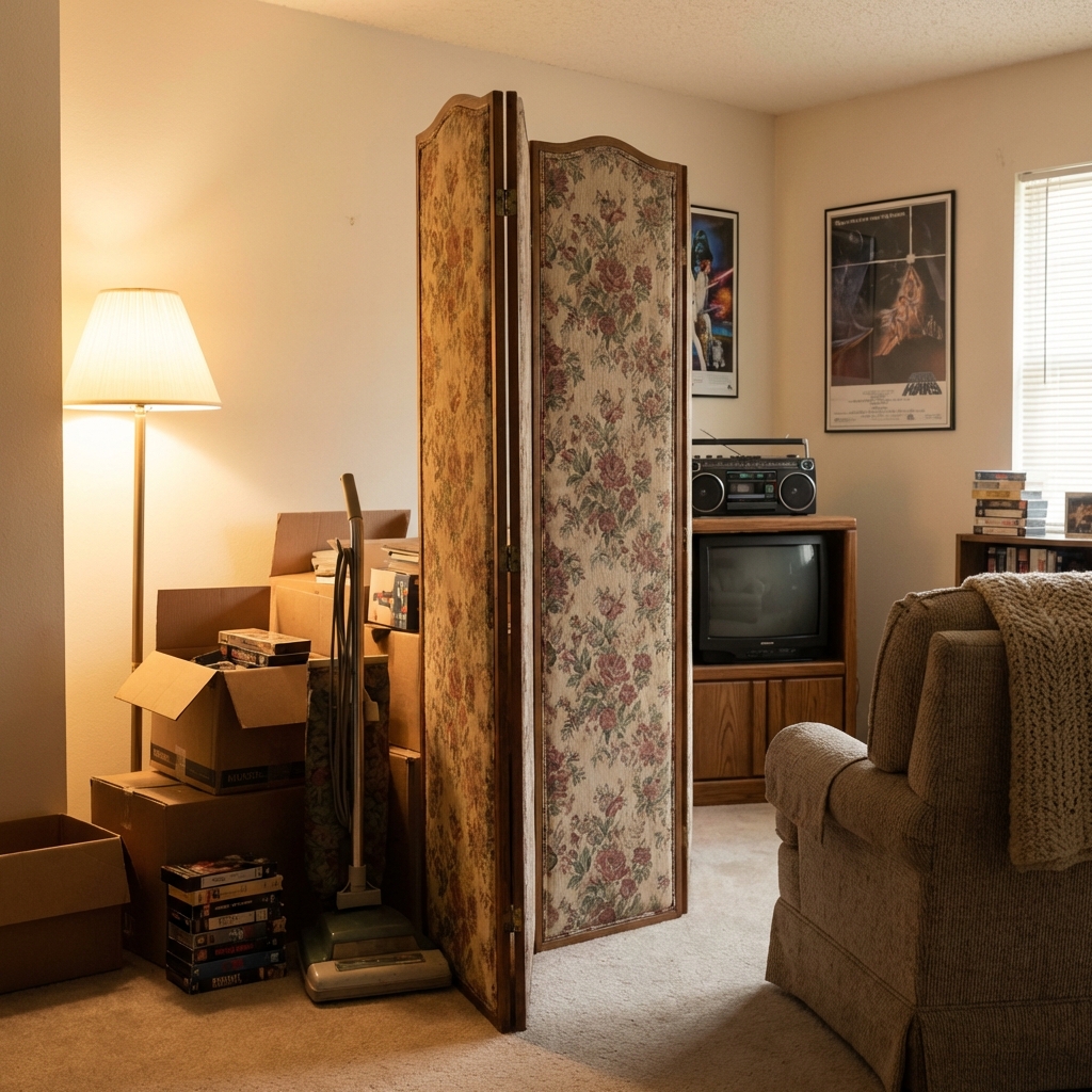 These three-panel or four-panel screens — often made of wood, fabric, or rattan — showed up in bedrooms, living rooms, and studio apartments. They hid cluttered corners, separated sleeping areas from living areas, and added a touch of something vaguely exotic.