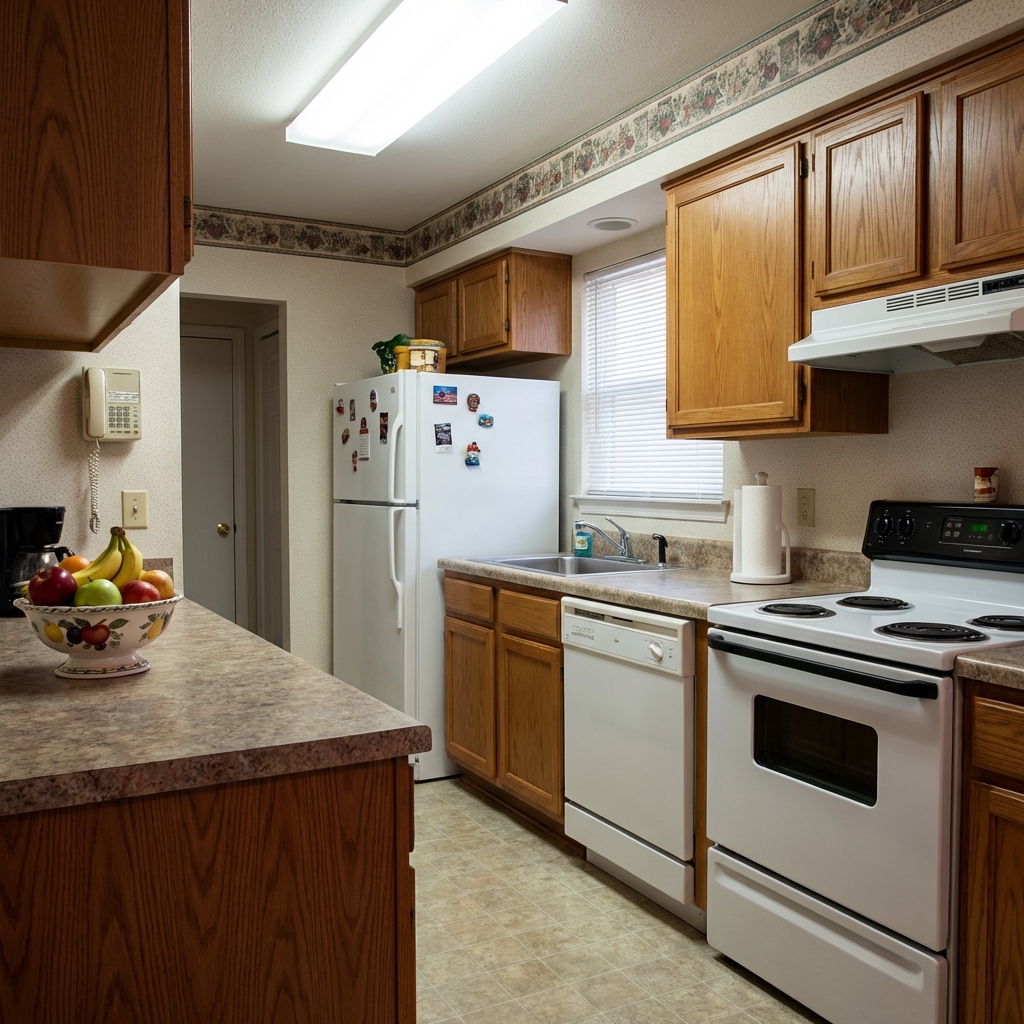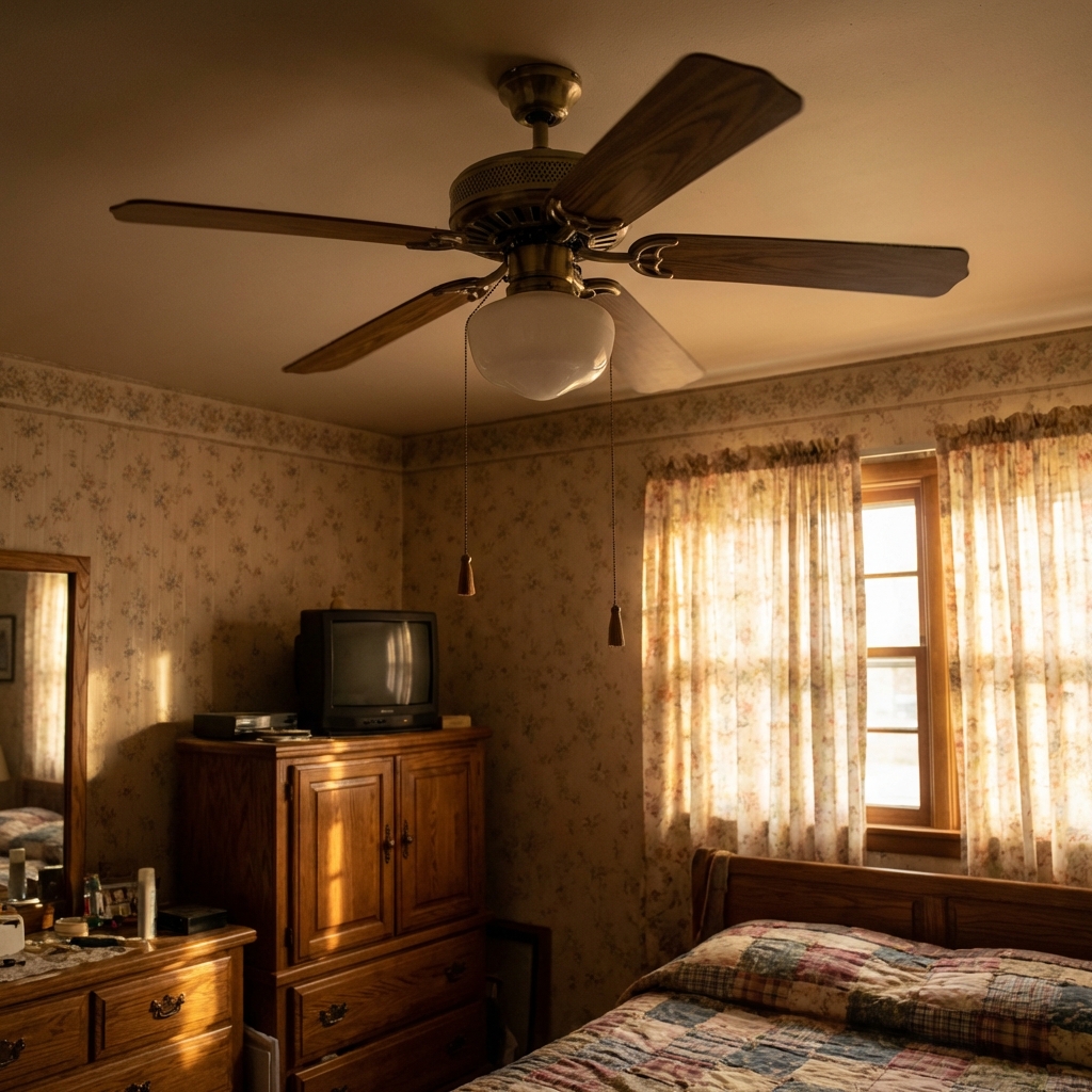 The standard-issue 90s ceiling fan had five blades — usually fake wood — a pull chain, and a frosted glass light kit underneath. The fancier ones had three speeds and a reverse switch for winter.