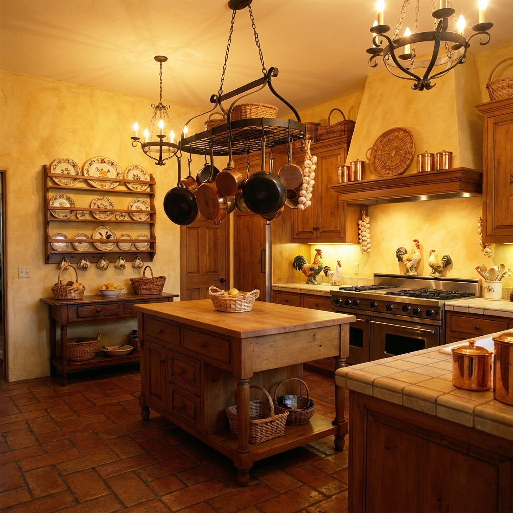 Terracotta floor tiles. Wrought iron pot holders. Faux-finished walls in warm yellow or burnt sienna. Decorative plates displayed on plate rails. Roosters on the countertops. Olive oil bottles used as decor. Wrought iron scroll work on everything.