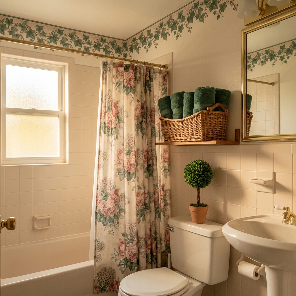 Ivy-patterned wallpaper borders. Faux topiary balls on the back of the toilet. Floral shower curtains. Leaf-shaped soap dishes. Wicker baskets holding rolled-up hand towels.