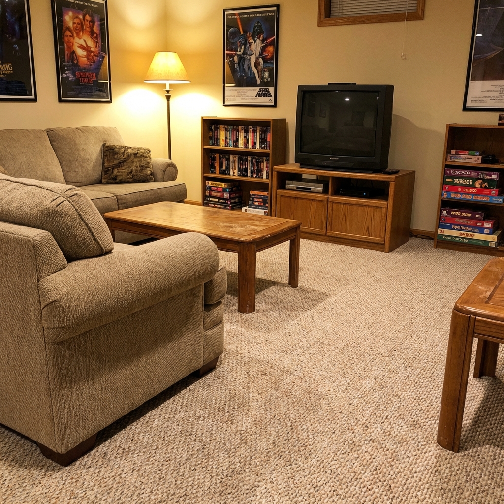 Berber carpet had a distinctive looped texture and a flecked, oatmeal-colored pattern that hid dirt and stains better than anything else on the market. It came in neutral tones — beige, tan, light gray — and it was installed in bedrooms, basements, hallways, and family rooms across the country.