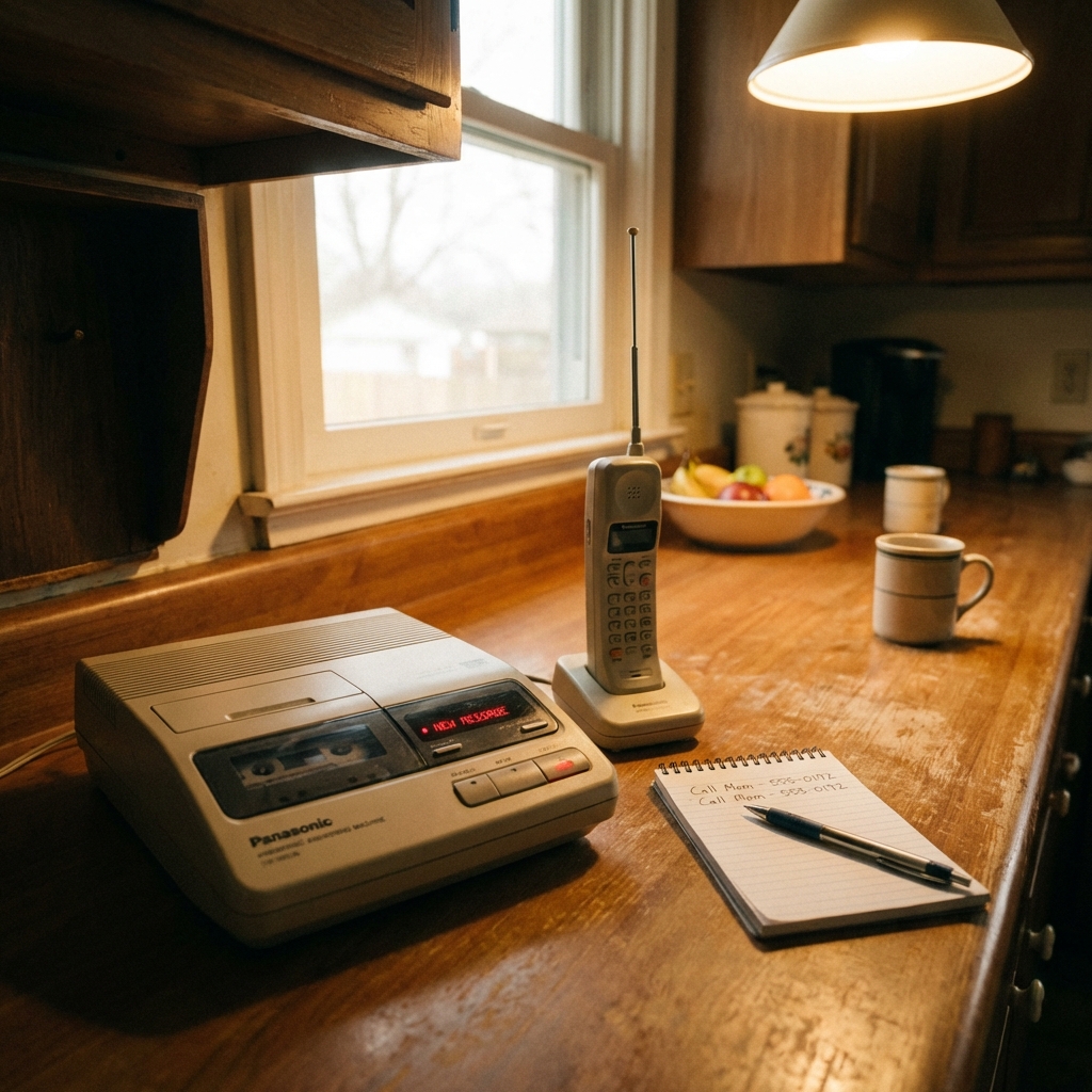 Before voicemail existed on your phone, messages were recorded on a small machine that sat next to the cordless phone — usually on the kitchen counter or a hallway table. It had a tiny cassette tape inside and a robotic voice that announced “you have… three… new messages.”