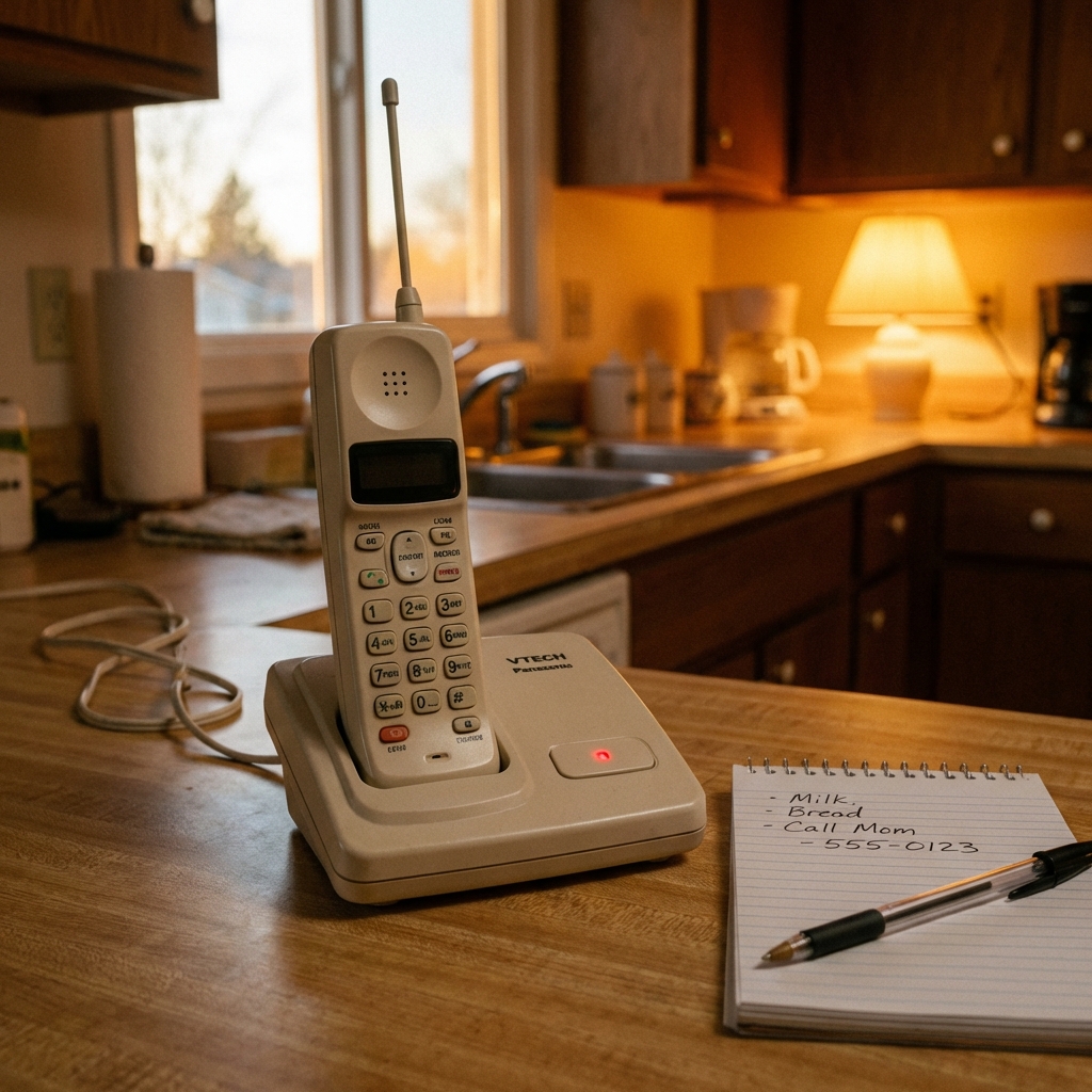 The phone lived on a charger base — usually in the kitchen or the hallway — and the base station had a little red light that told you it was charging. If someone forgot to put the phone back on the base, it died. And then nobody could find it.