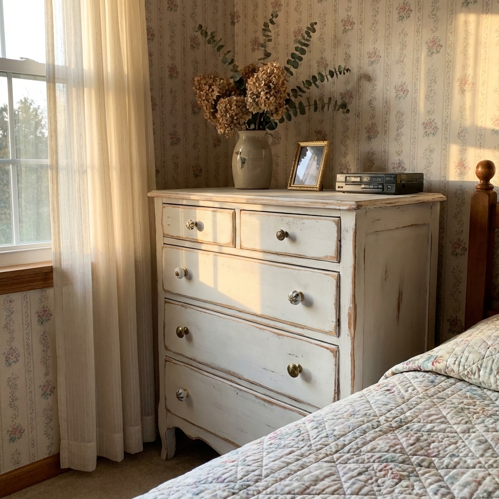 Suddenly, furniture was supposed to look old. Dressers were painted white and then sanded down at the edges to reveal the wood underneath. Tables were “distressed” — intentionally scratched, dented, and worn to look like they had been in a farmhouse for a hundred years.