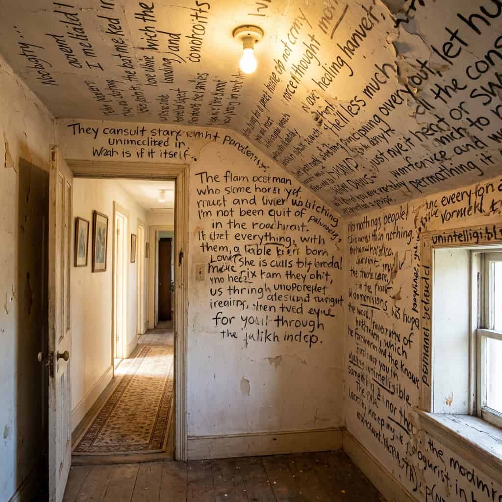 You open the door to a spare bedroom, a basement room, or an attic space — and every inch of every wall is covered in handwriting.