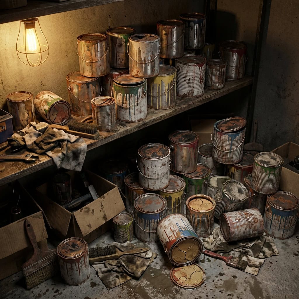 These paint cans represent every room, every accent wall, every weekend project, and every regret the previous owner ever had. Somewhere in that stack is the exact shade of gray they used in the bathroom in 2016 and the burnt orange they tried in the bedroom and painted over three days later.