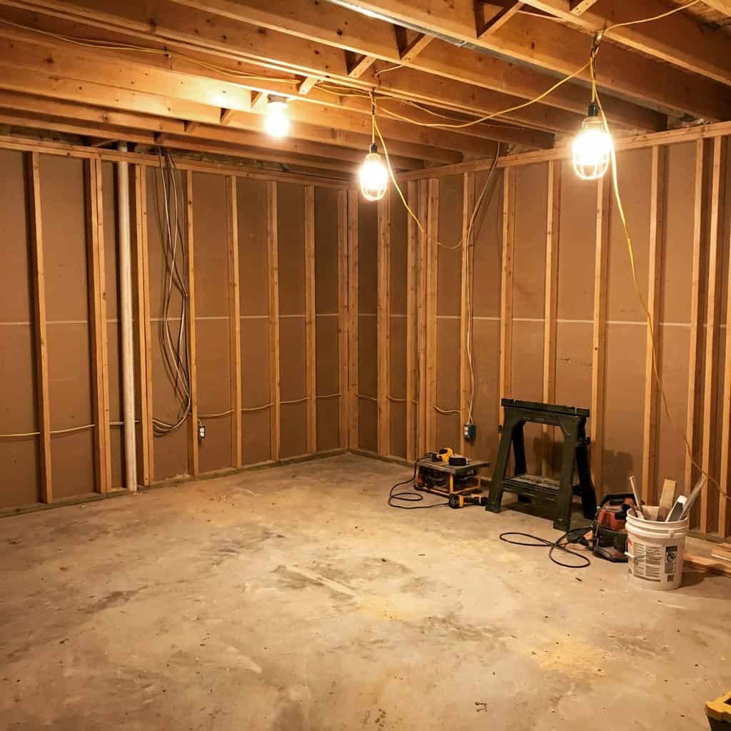 The basement has new framing. The studs are up. The electrical is roughed in. But there is no drywall, no flooring, and no indication that anyone planned to finish what they started.