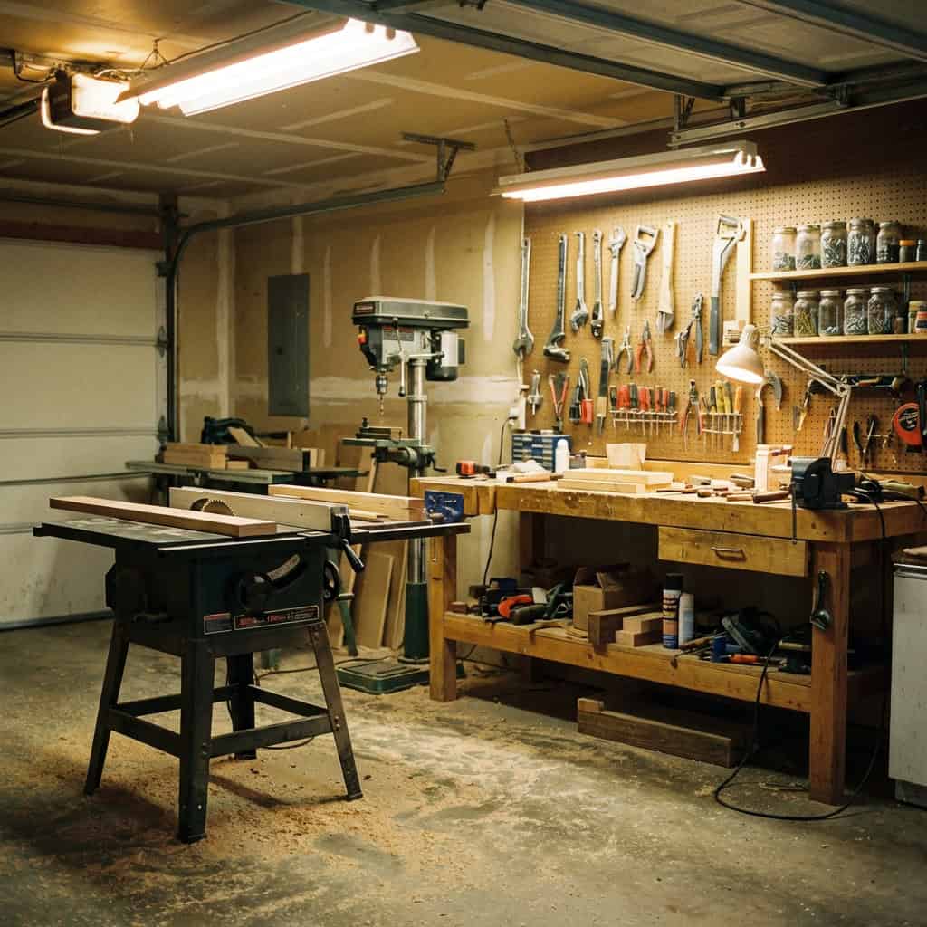 You open the garage, the basement, or a detached workshop and find a complete setup. Table saw. Drill press. Hand tools hanging on a pegboard. Clamps. Chisels. Jars of screws and nails organized by size. A workbench with decades of use worn into the surface.