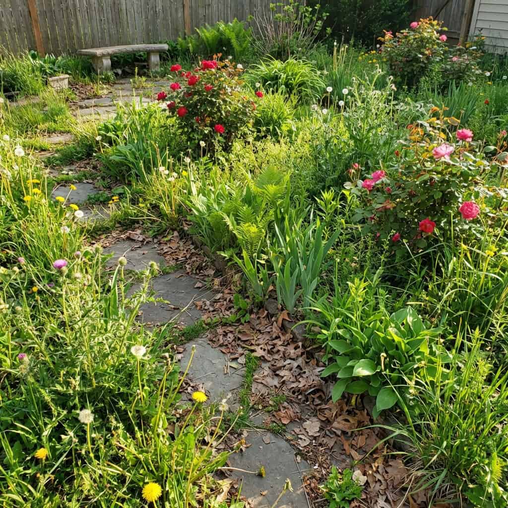 Bulbs come up in places you did not plant them. Perennials emerge in organized rows you did not notice under the weeds. A rose bush blooms against the fence. An herb garden reveals itself near the kitchen door. A stone path appears under the dead leaves.