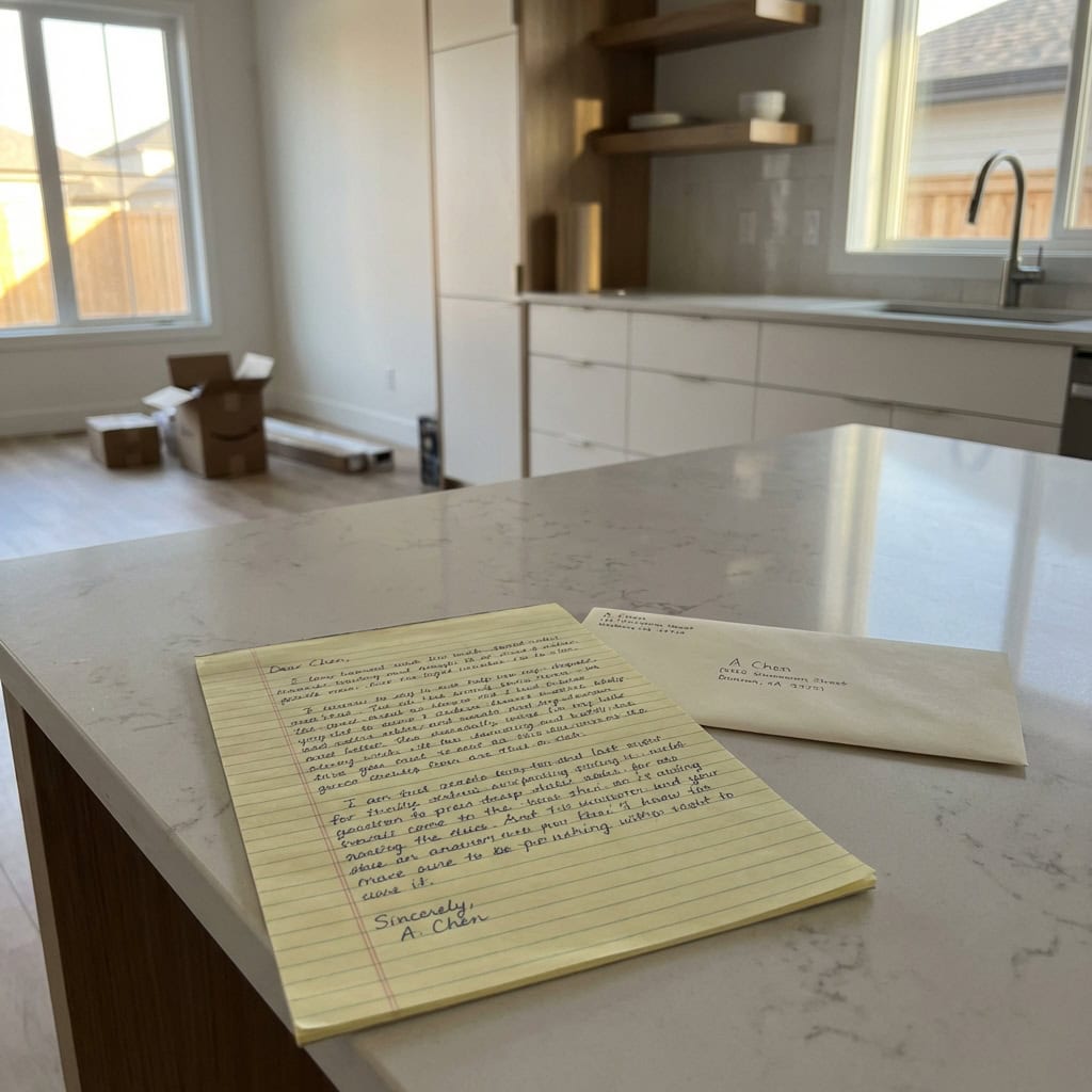 You move in and find an envelope on the kitchen counter, or taped to the inside of a cabinet door, or left in the mailbox. Inside is a handwritten letter from the previous owner.