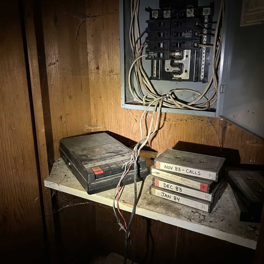 A new homeowner opens an electrical panel, a closet, or an old junction box and finds something that should not be there. A small camera. A recording device. Wires spliced into the phone line leading to a box of cassette tapes filled with recorded conversations.