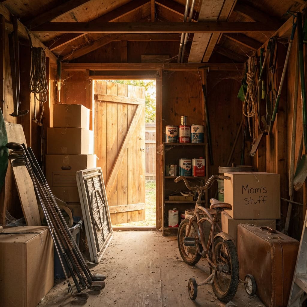 The shed is the place where things went to be forgotten. Every item was important enough to keep but not important enough to bring. The previous owner made a hundred small decisions — keep, trash, keep, trash — and the “keep” pile ended up here, in a shed they were apparently willing to walk away from.