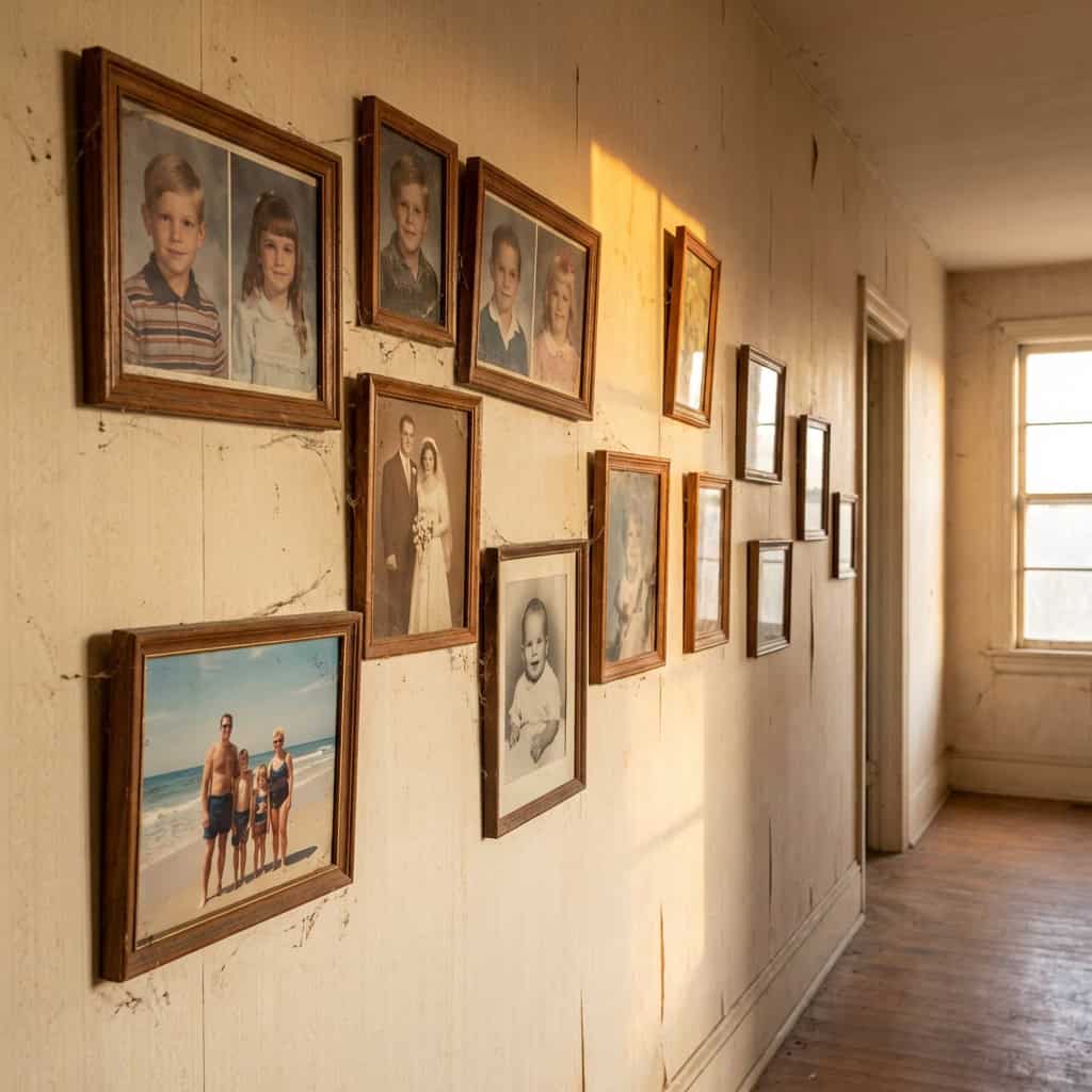 The photos are still hanging when the new homeowner walks through for the first time. Nails in the wall, frames level, glass clean. A family frozen in time, smiling at a room they no longer live in.