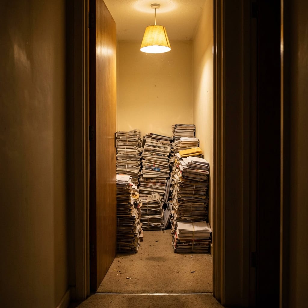 The room is full. Not with furniture — with paper. Newspapers stacked in columns from the floor to within inches of the ceiling. Mail — opened and unopened — piled on every surface. Catalogs, magazines, flyers, and junk mail compressed into dense layers that have fused together from years of weight and humidity.