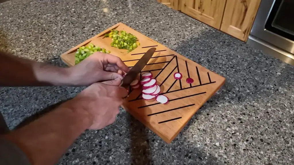 The next cutting board takes a more functional approach, featuring patterned lines and ingredient pockets.