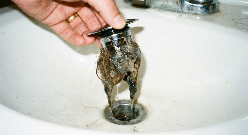The culprit is a massive clump of hair and soap scum wrapped directly around the pop-up stopper mechanism right below the drain.